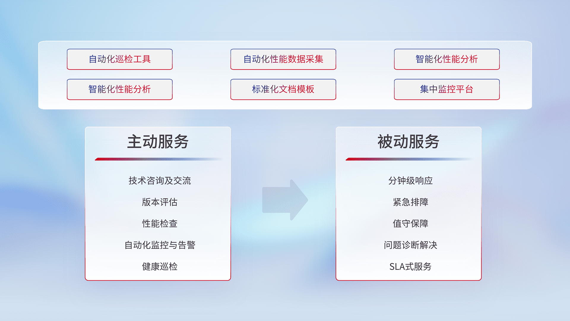 智能化工具和标准化文档,,,保障服务质量,,提供主动服务(包含技术咨询、、版本评估、、、、性能检查、、自动化监控与告警、、、、健康巡检)和被动服务包含(分钟级响应、、紧急排障、、、值守保障、、、问题诊断解决、、、、SLA服务)。。。。