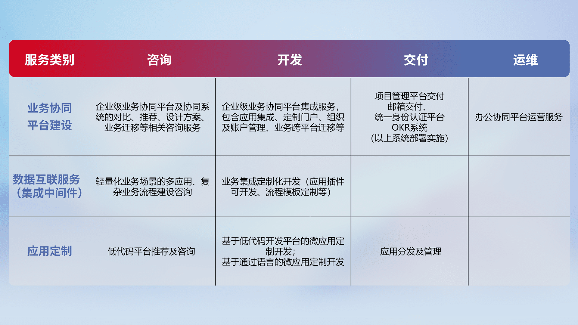 针对钉钉、、企微、、、、IDaas等平台级产品提供产品的规划、、方案、、、交付、、、、定制化开发等服务,,实现如统一协同办公、、、智能客户服务、、、混合会议管理、、、智能数据查询、、、、等业务场景,,,,实现数字化转型。。